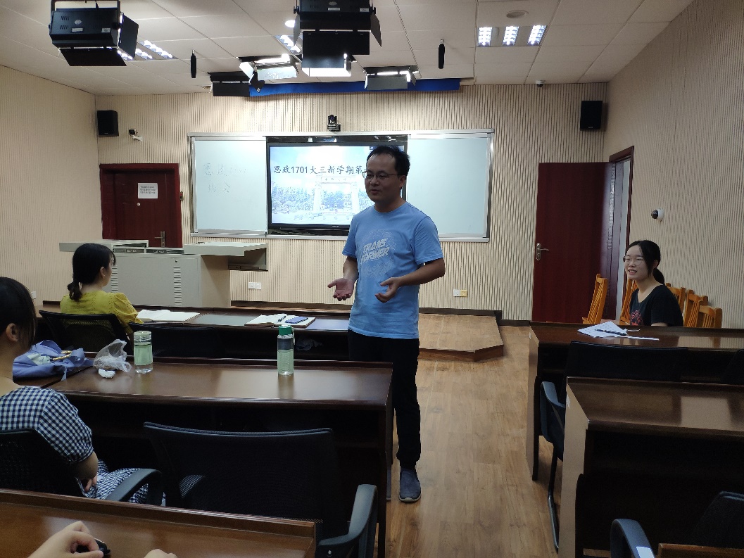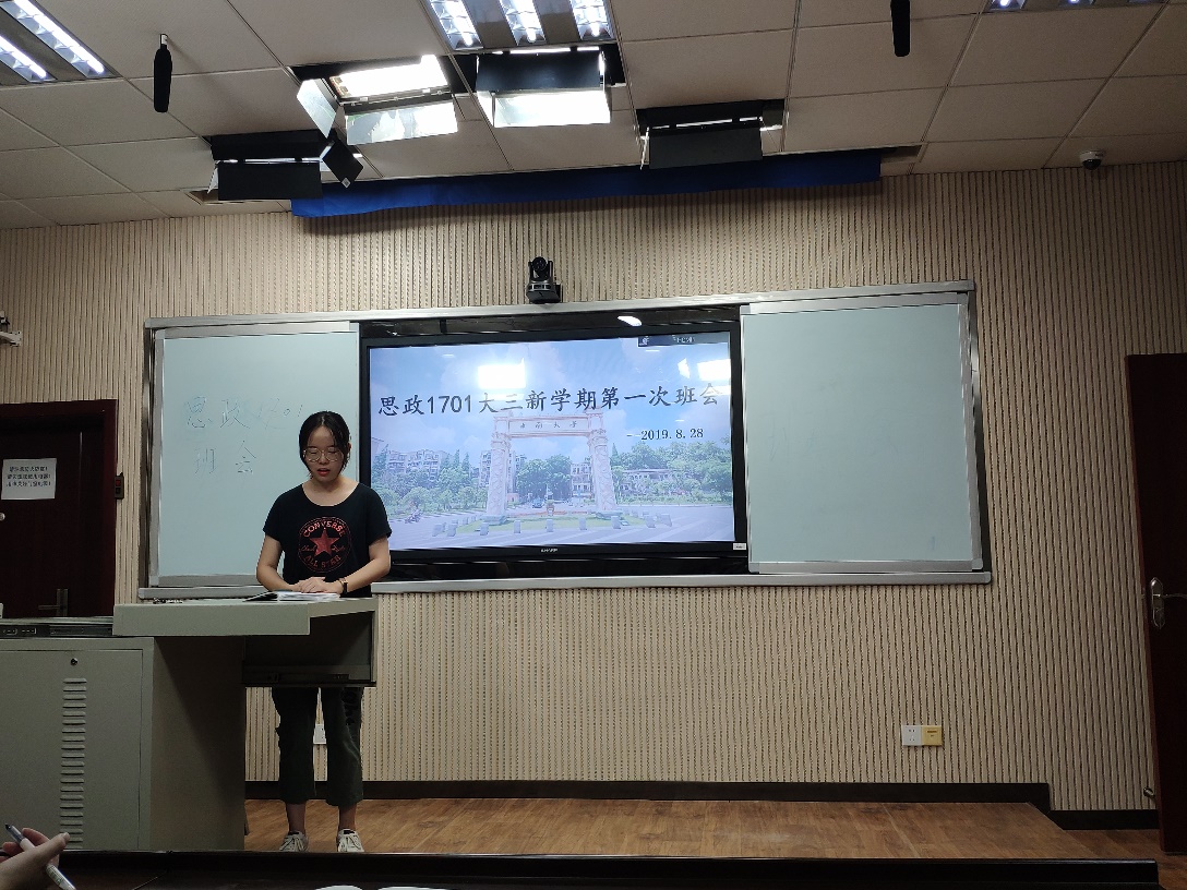 转眼间,暑假生活已结束,新的学期又开始了。新的学期预示着新的希望,在即将开始的新学期里,为了让同学们在新学期能够更好地投入学习和大三新生活,思想政治教育1701班全体同学于8月28日下午在全讯800cc大白菜官网教学楼608教室举行大三新学期第一次班会,此次班会由班长王璞同学主持,班导师胡栋材老师、辅导员邹秉虹老师也出席班会。