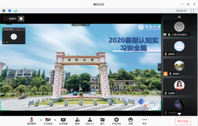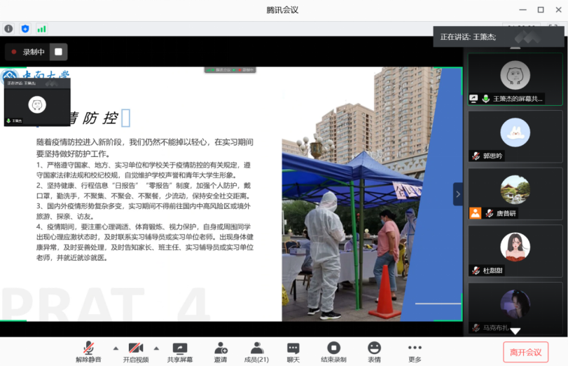 至此,此次大会圆满结束。通过此次暑期认知实习安全宣传线上交流会,同学们增强了安全意识,提高了安全警惕,更加地熟悉了解实习期间相关的安全问题以及学习掌握了安全防范的具体措施。希望思政1801班同学们重视自身安全,圆满完成认知实习任务。
