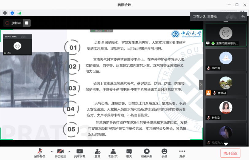 会议伊始,安全委员王箫杰同学着重强调了实习期间安全问题的重要性,提醒大家一定要提高安全防范意识,做好安全防范措施。王箫杰同学详细地向大家介绍实习期间相关的安全知识,就疫情防控、交通安全以及防洪防汛三个方面全面地向大家普及安全常识,从多个角度讲述了在日常生活中如何保障自身安全以及避免这些安全隐患的方法。