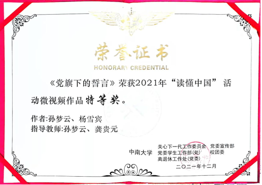 我院创作的《党旗下的誓言》荣获2021年“读懂中国”活动微视频作品“特等奖”。