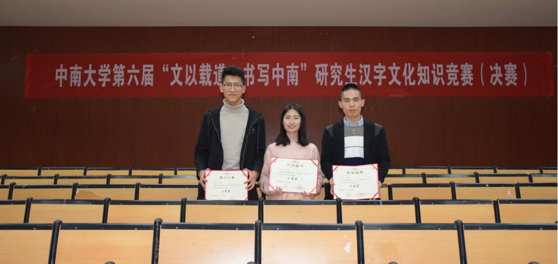 11月25日下午,由600cc全讯白菜自助注册学生工作部(处)主办,文学与新闻传播学院承办的第六届“文以载道·书写中南”研究生汉字文化知识竞赛决赛在文法楼222多功能报告厅成功举行。学生工作部徐赞副部长、文学与新闻传播学院马国荣副书记等领导老师出席本次比赛。 初赛全校共有41支队伍,123名研究生选手参与,以笔试的形式进行。经过公平而激烈的角逐,共有8支队伍最终挺进决赛,我院2018级研究生郭敬广、苏鹏和苏海荣组建的“知礼队”位列全校第六。