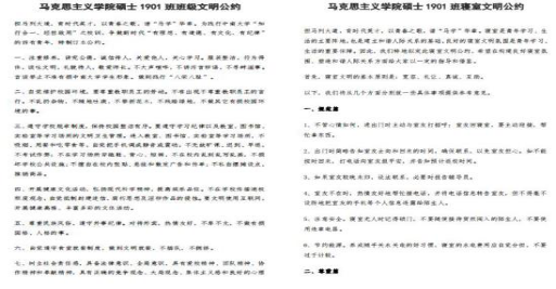 举凡有制,运行有序。为了增强班级的规范性和向心力,推进“马理论”硕士1901班有序、长远、稳健的发展,班委在学校、学院相关文件精神的指导下,在学院领导老师的支持下制定了相关制度机制。一是在班级建设层面,建立了“党-团-班-导”四位一体的协同管理机制,在学院党组织和分团委的领导下,立足班级,侧重学生全面发展,贯彻导师责任制,发起师生沟通交流倡议,同时加强了班级同学与学院不同导师的交流与沟通。二是在班级学风层面,全体签署学术规范承诺书,制定“研究生熄灯公约”、“班级文明公约”和“学术诚信道德公约”,将诚信、创新、勤奋、自律、有为的学风植根于班级同学心中。三是在班委管理层面,每月召开1次班委会,树立“服务导向”意识,“以人为本”意识,积极主动开展班级工作。