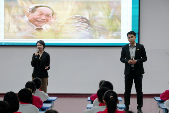 “袁隆平爷爷像长在地里的稻草人,腰弯成90度,一手拿放大镜,一手拿镊子,几乎把人要埋进稻浪中。”正是这样的身影给宣讲员夏威、王文燕、李馨茹带来了无尽的灵感。他们以《爷爷,稻子熟了》为题,绘声绘色地为小学生们讲述了袁隆平那“喜看稻菽千重浪”的一生。小学生们仿佛亲眼看见这位稻田守望者的坚定信念与不懈追求。